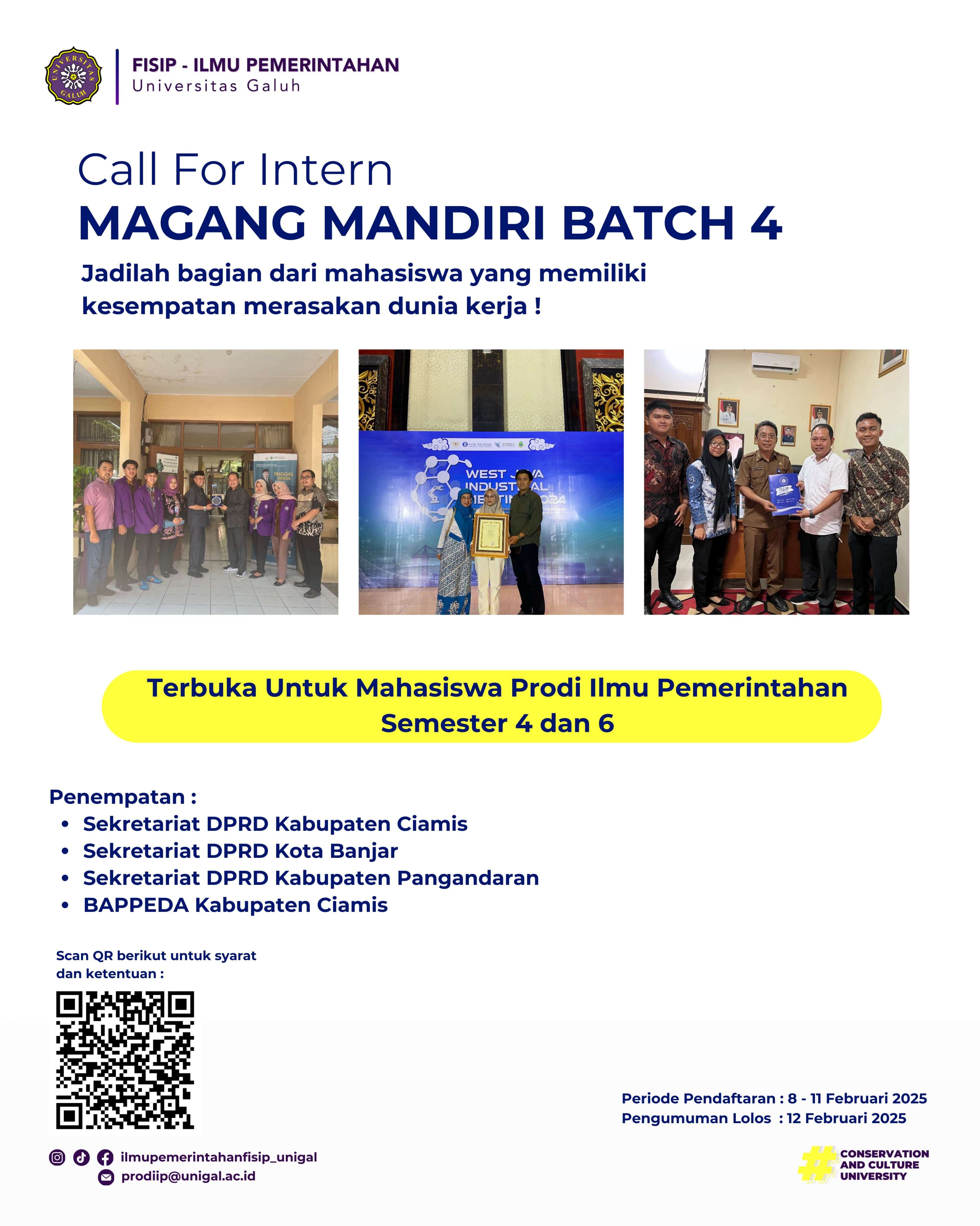 B. Ketentuan 1. Mahasiswa Aktif Program Studi Ilmu Pemerintahan 2. Sedang/akan menempuh semester 4 dan 6 3. IPK Minimal 3.00 4. Diperuntukan bagi mahasiswa yang belum diterima di Program MBKM di semester Genap T.A. 2024/2025 5. Kegiatan magang mandiri berdurasi selam 1 (satu) semester 6. Mendaptkan konversi nilai sebanyak 20 SKS
