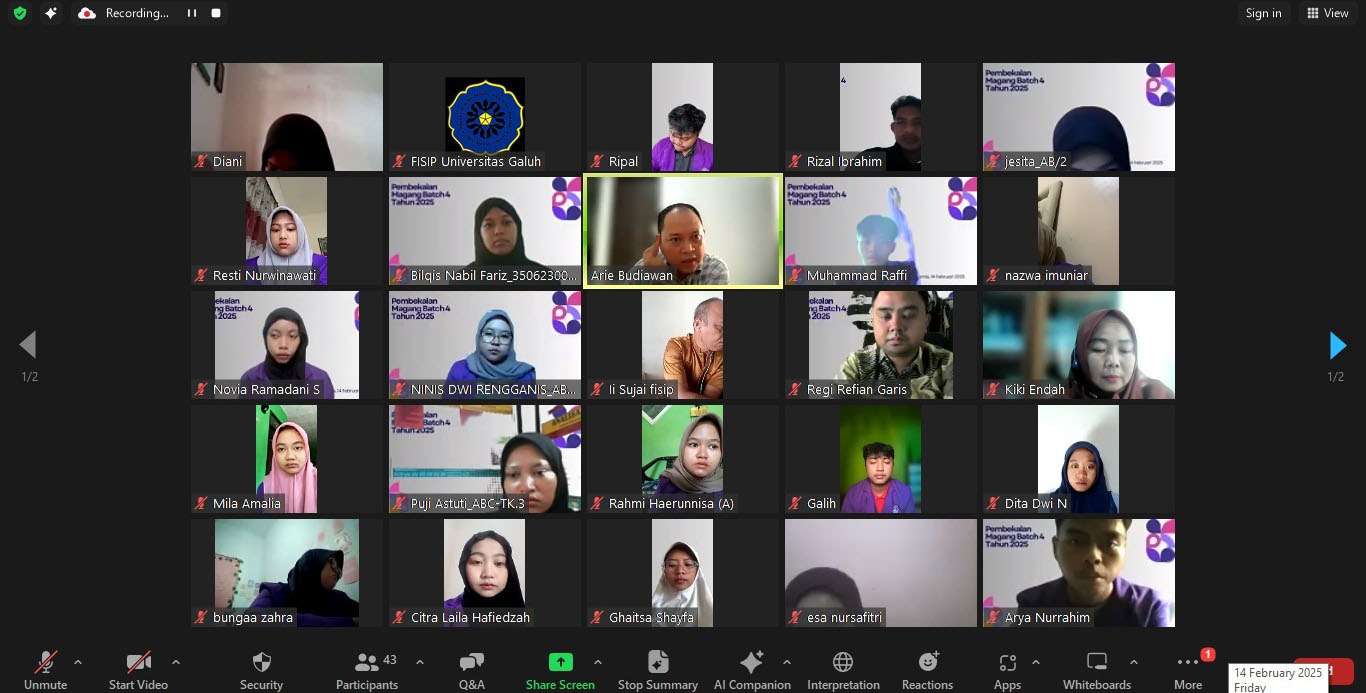 Ciamis, 14 Februari 2025 – Program Studi Ilmu Pemerintahan Fakultas Ilmu Sosial dan Ilmu Politik Universitas Galuh telah melaksanakan kegiatan pembekalan bagi peserta Magang Mandiri Batch 4 Tahun 2025. Sebanyak 40 mahasiswa tingkat 2 dan 3 yang telah lulus seleksi program magang ini mengikuti kegiatan pembekalan yang diselenggarakan secara daring melalui Zoom Meetings pada pukul 08.00 hingga 12.00 WIB.